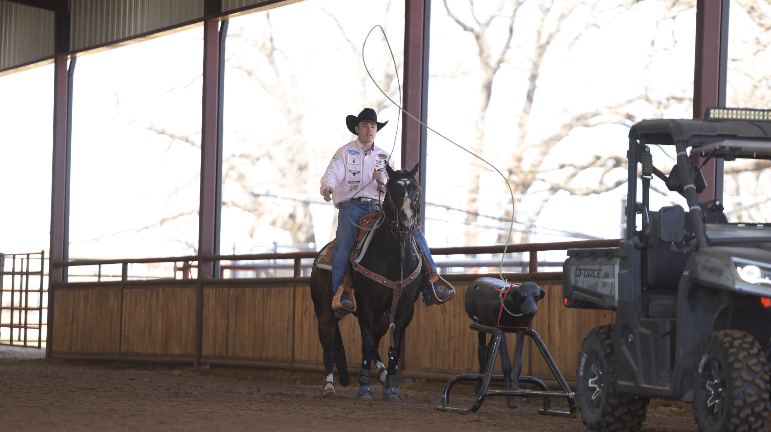 When Blane ropes the dummy, he’s not just thinking about the throw—he’s training the horse every step after.
